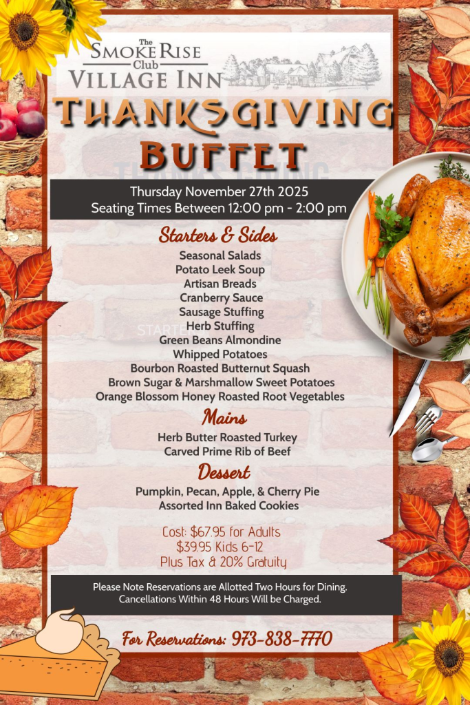 If you’re looking for the perfect place to celebrate Thanksgiving this year look no further than the Smoke Rise Inn. Dine from a beautifully prepared buffet to include all your holiday favorites, from Roasted Turkey and Stuffing, to carved Prime Rib and Bourbon Butternut Squash. Call the Inn soon at (973) 838-7770 to guarantee your reservation before we sell out.